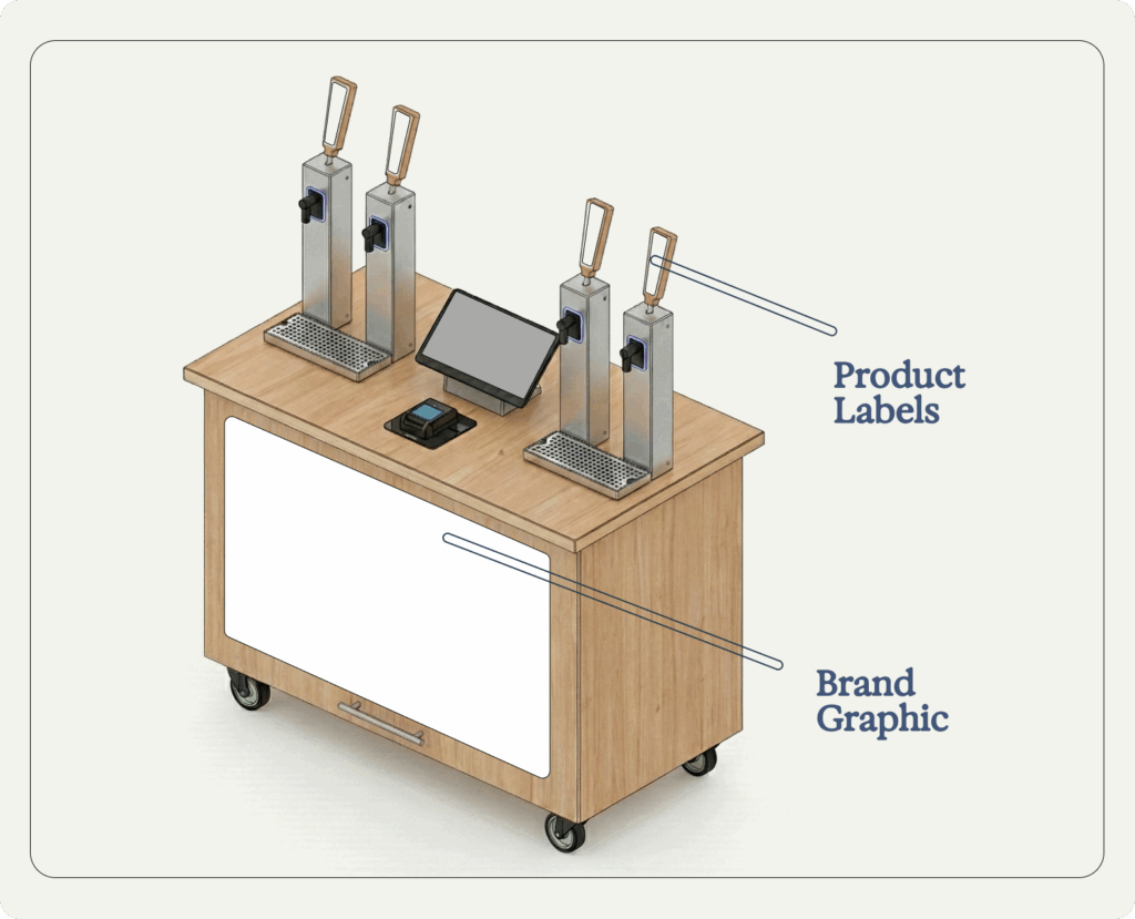 The tap handles, LED colors, touch screen user interface, and the vinyl wrap for the storage portion of the station are all customizable.